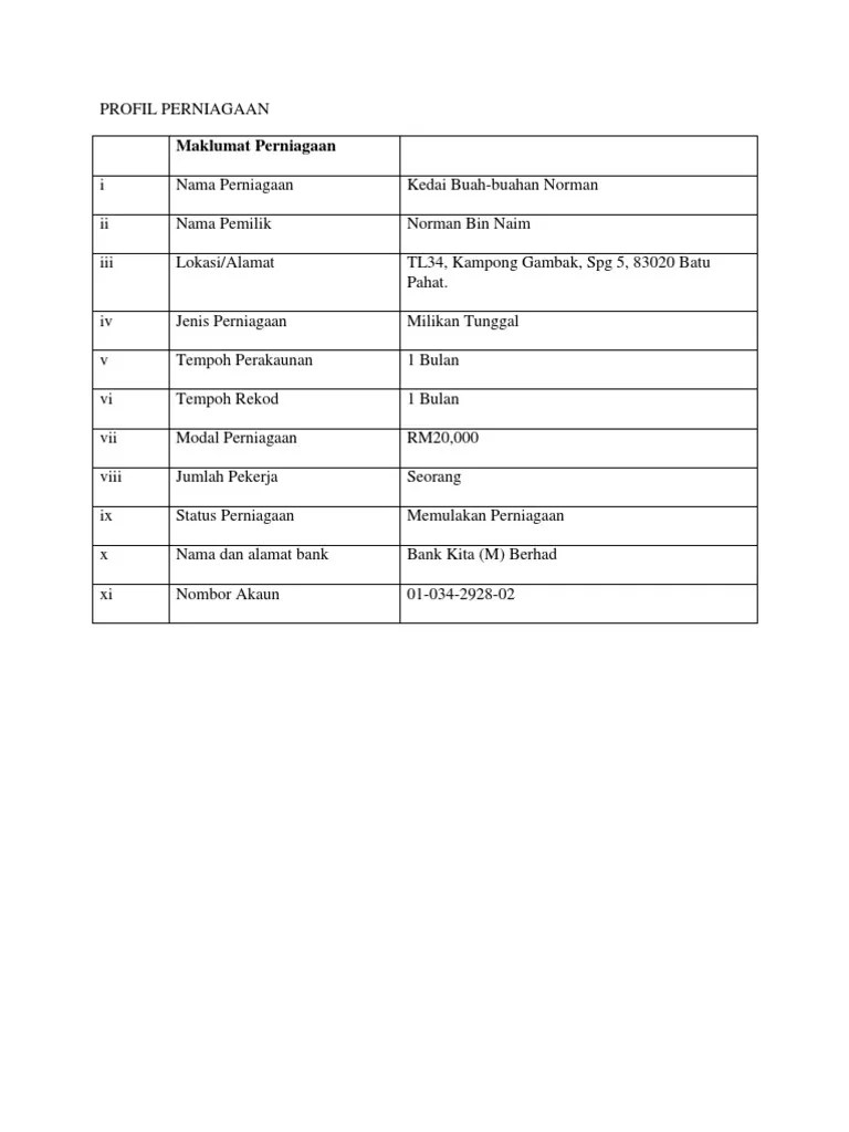 Perniagaan ini berbentuk milikan tunggal dan akan beroperasi di no.15